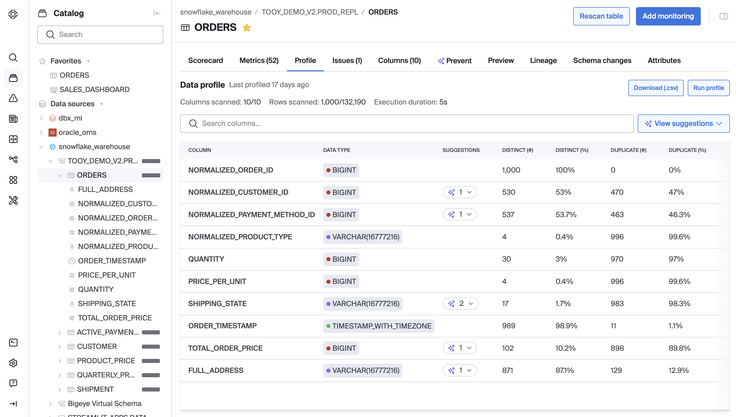 After a profile run, Bigeye surfaces bigAI-generated and algorithmic suggestions that can be deployed quickly.