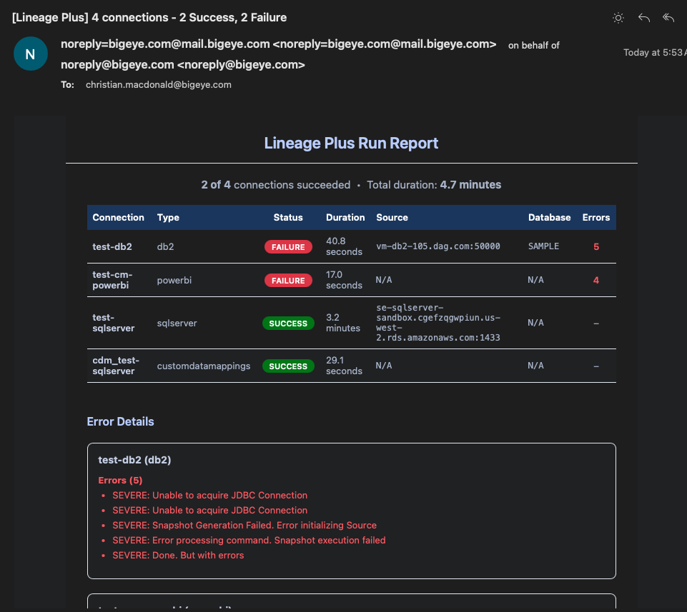 The Lineage Plus agent can send email notifications after lineage runs complete, providing a summary of successes and failures across all connections.
