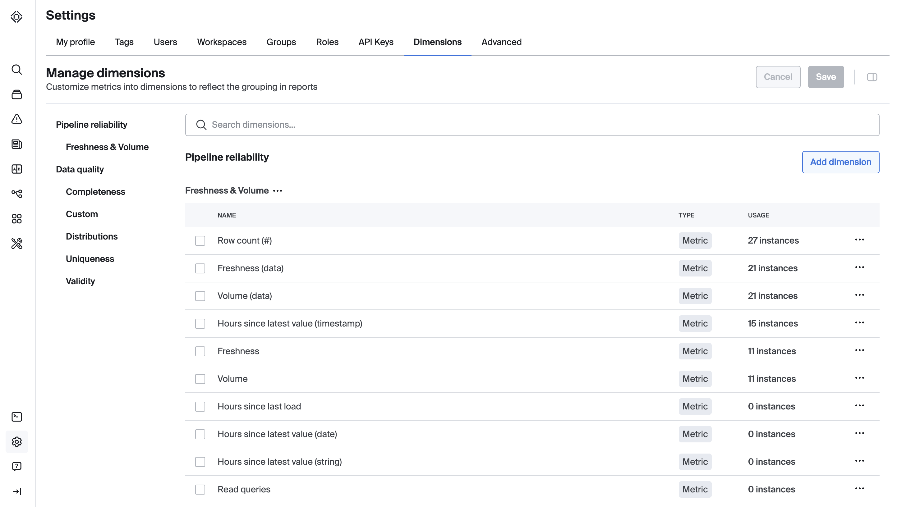 - Add up to 15 dimensions (default is 6: Completeness, Validity, Uniqueness, Distributions, Pipeline Reliability, Custom)