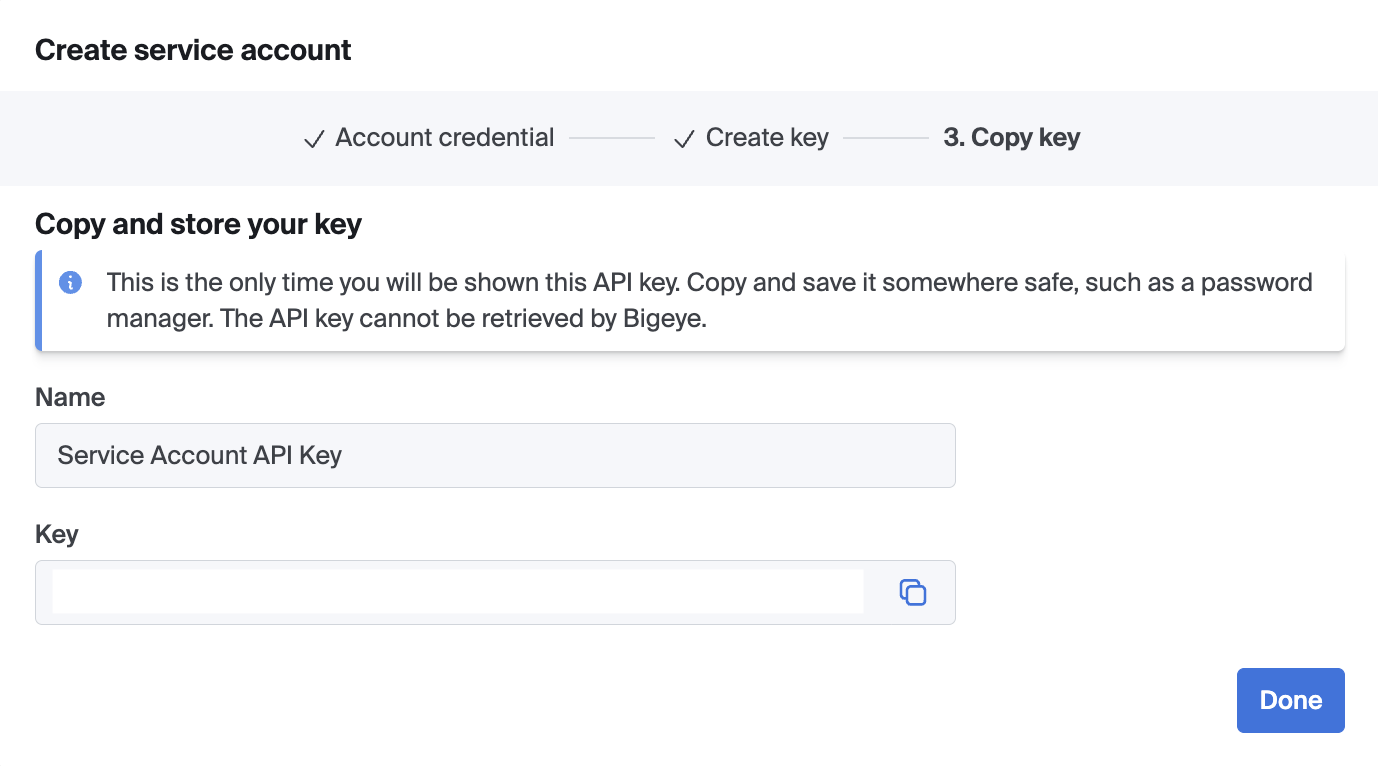 - Copy the generated API key and store it securely. For security reasons, it will only be shown once and cannot be retrieved after closing this modal. Click Done once you have copied the API key.