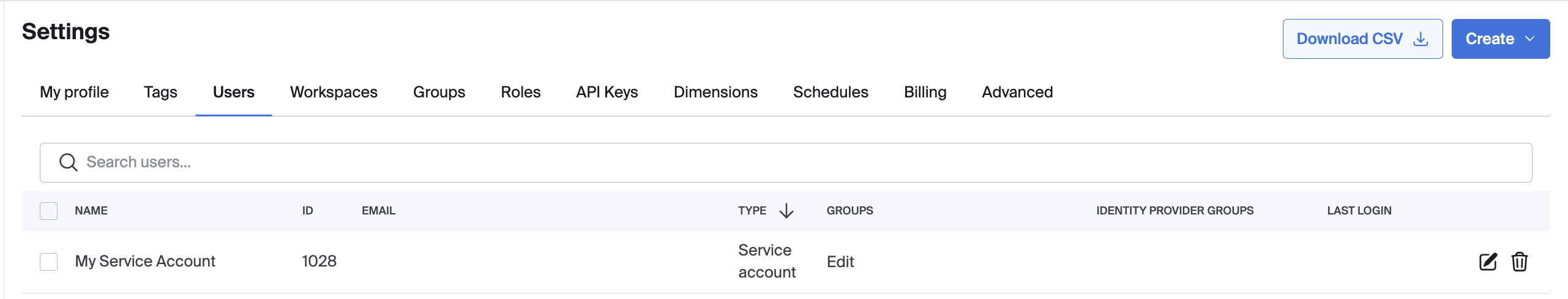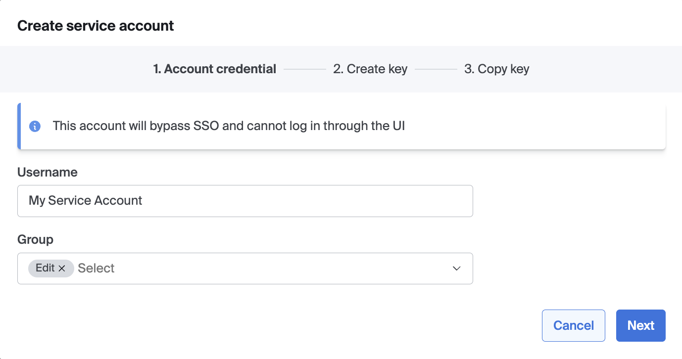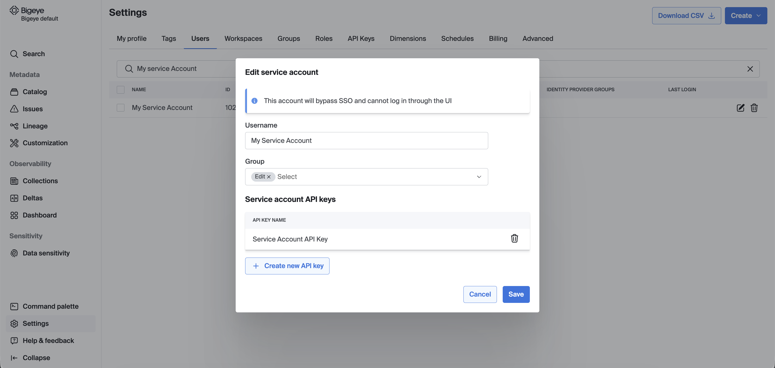 Programmatic Access Only Service accounts cannot log into the Bigeye UI and are intended for API and SDK usage only.