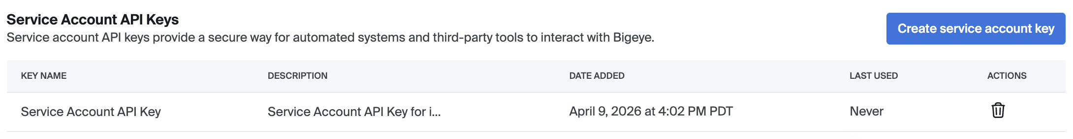 Service accounts allow you to: • Authenticate to Bigeye APIs without using a personal user account • Assign scoped permissions using roles • Generate and manage API keys for integrations • Maintain auditability for automated activity