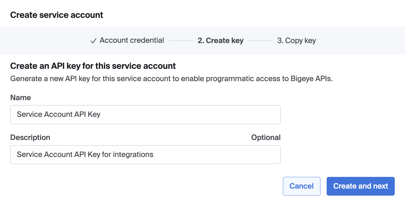 - If you are creating an API key for a service account, provide a name and optional description to help identify its purpose.