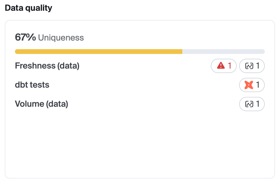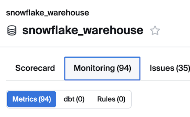 - dbt Test Monitor types appear as aggregated in the scorecard per each data dimension (“dbt Tests” shows as one row). Note in the screenshot below that metric monitors are denoted by the new metric symbol and dbt monitors are denoted by the dbt icon.