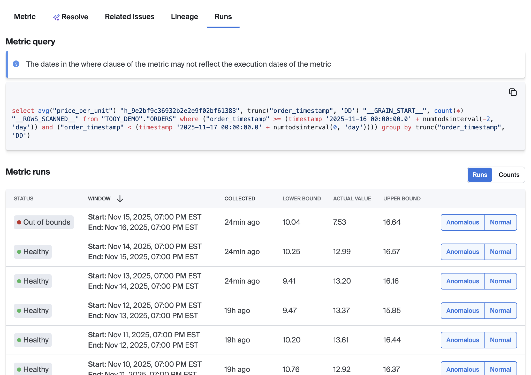 The Runs tab includes a list of each data point in the metric's time series, and the ability to adjust the annotation for each point that is used to train the Autothresholds model for the selected metric.