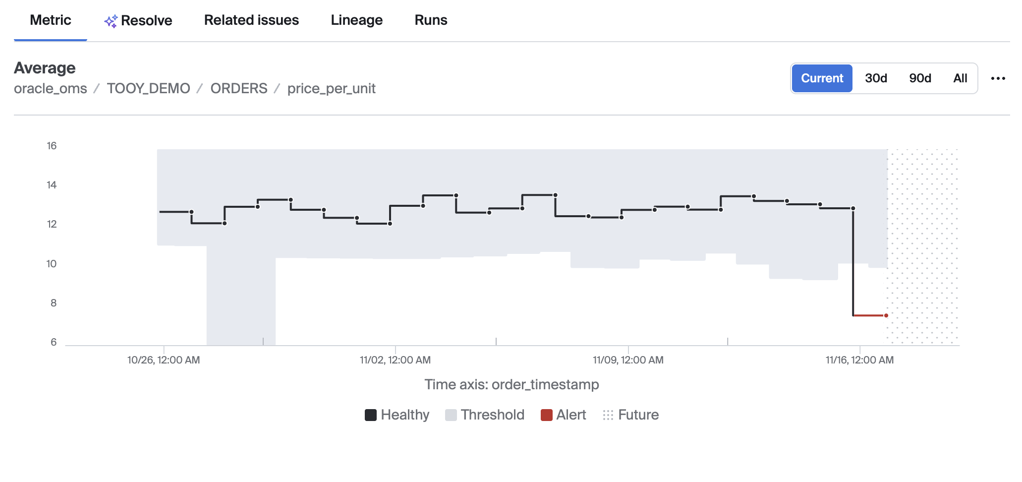 The metric tab's chart shows a time series visualization of the underlying alerting metric. You can view additional metric details such as the name of the metric, the configuration, and any suggestions on the root cause or impact that Bigeye can provide under the Overview tab in the right pane.