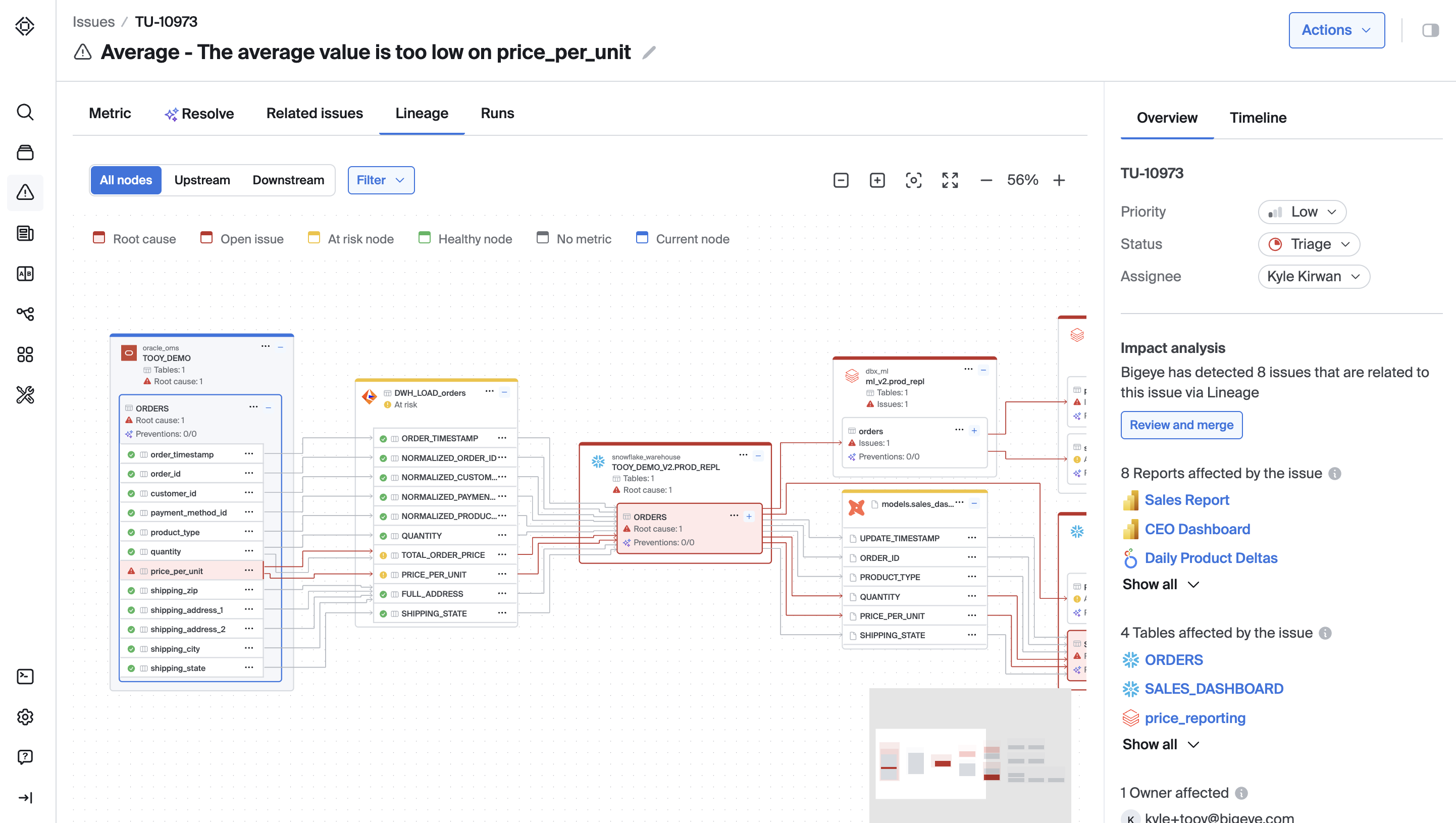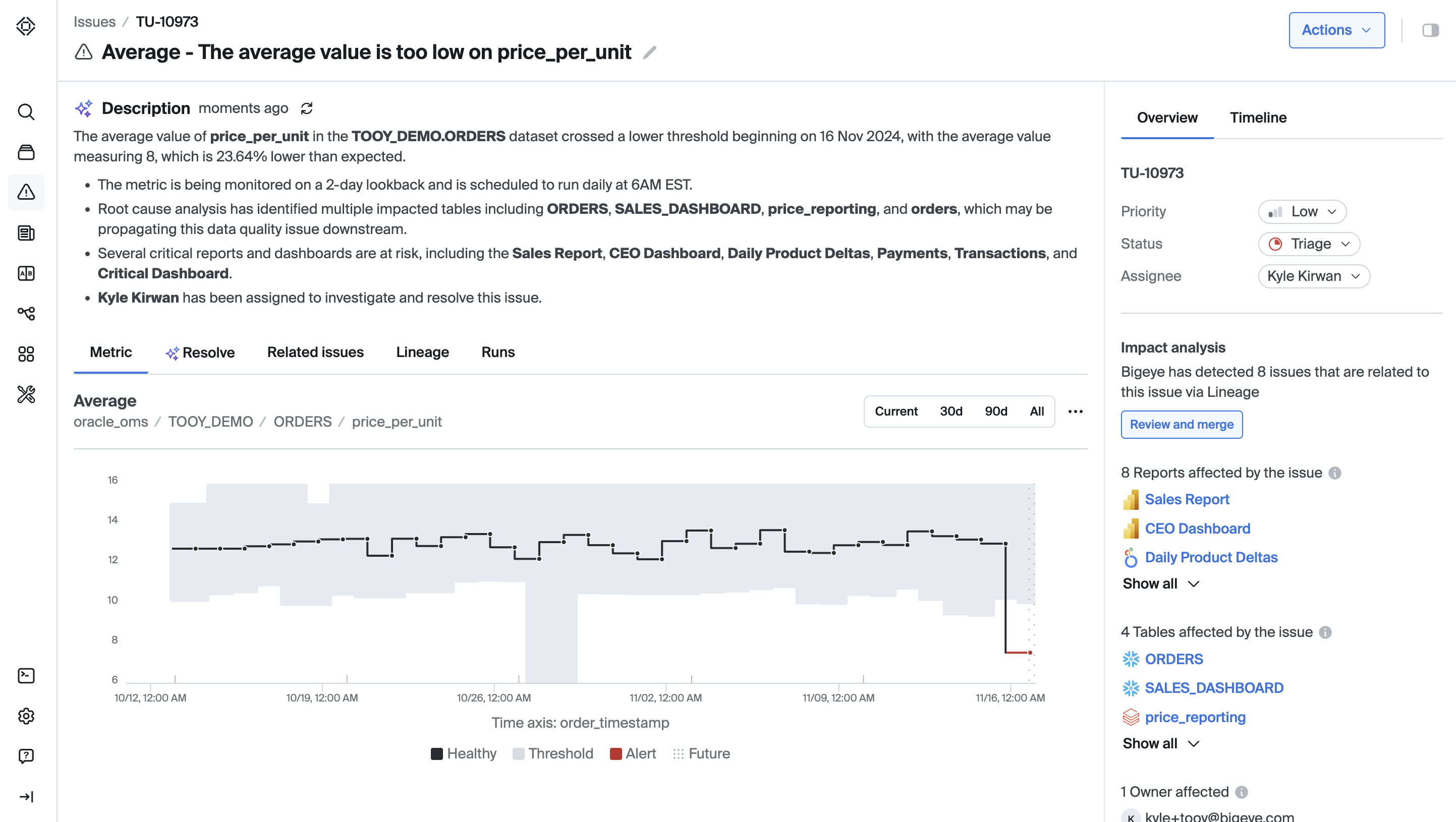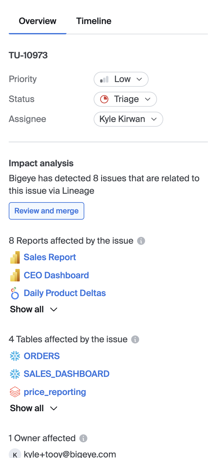 The issue detail page shows you all the key details about the issue including when it occurred, the downstream impacted analytics, tables, and data stewards, and a summary generated by bigAI.