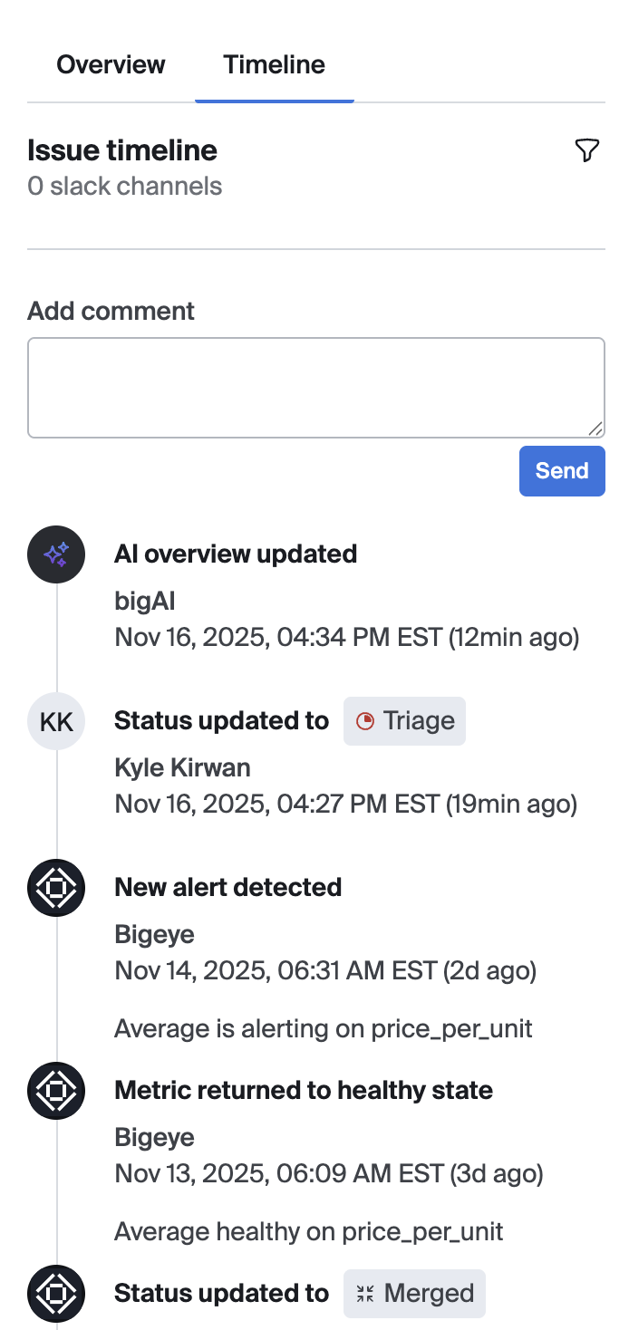 The timeline view shows a history of all updates about the issue, including new alerts, comments from users, and other status changes.