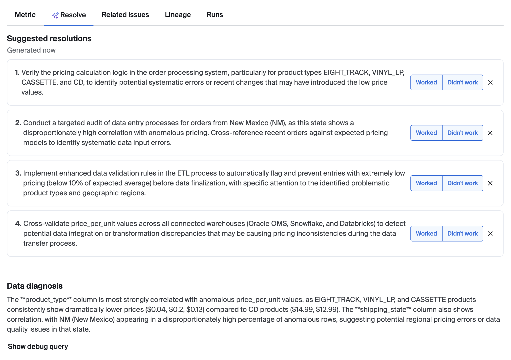 The Resolve tab helps you identify resolution steps to fix the issue, as well as diagnostic information that can help explain why the issue is happening. Suggestions are generated using bigAI if it is enabled in your account.