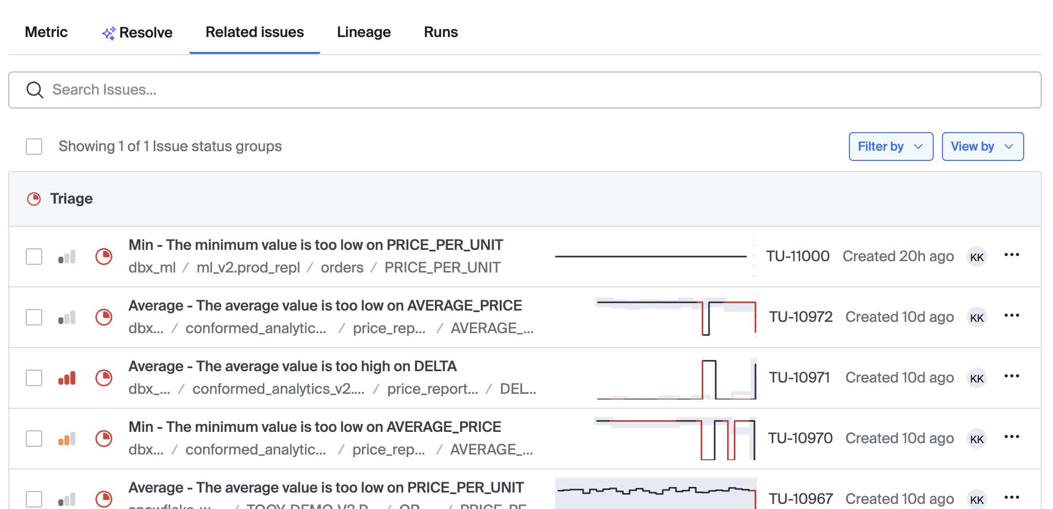 The Lineage tab shows the data lineage of tables and columns upstream and downstream from the table/column impacted by the currently selected issue. It's easy to visually trace the downstream impact of the issue, or to follow an upstream trace to a potential root cause location.