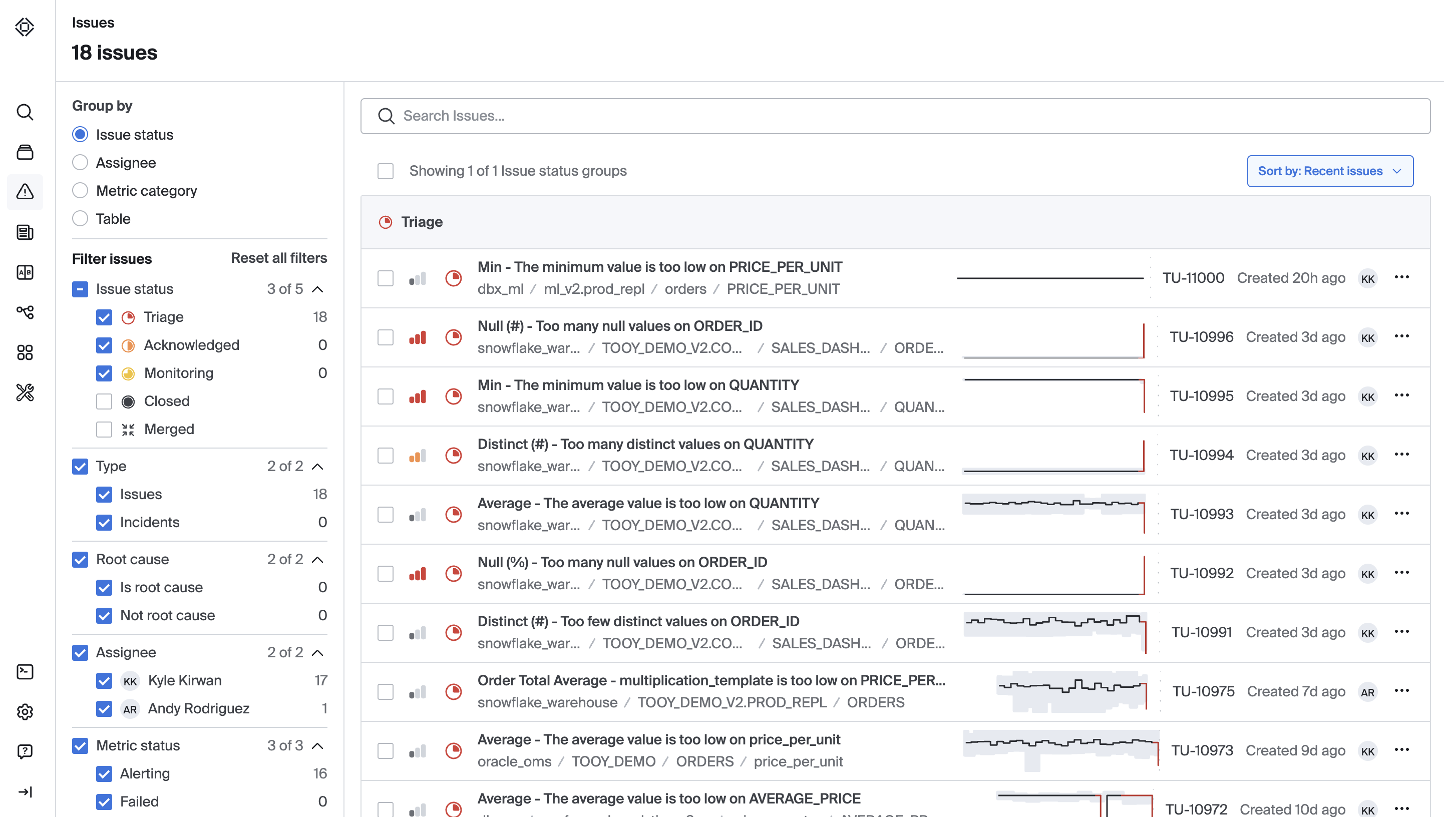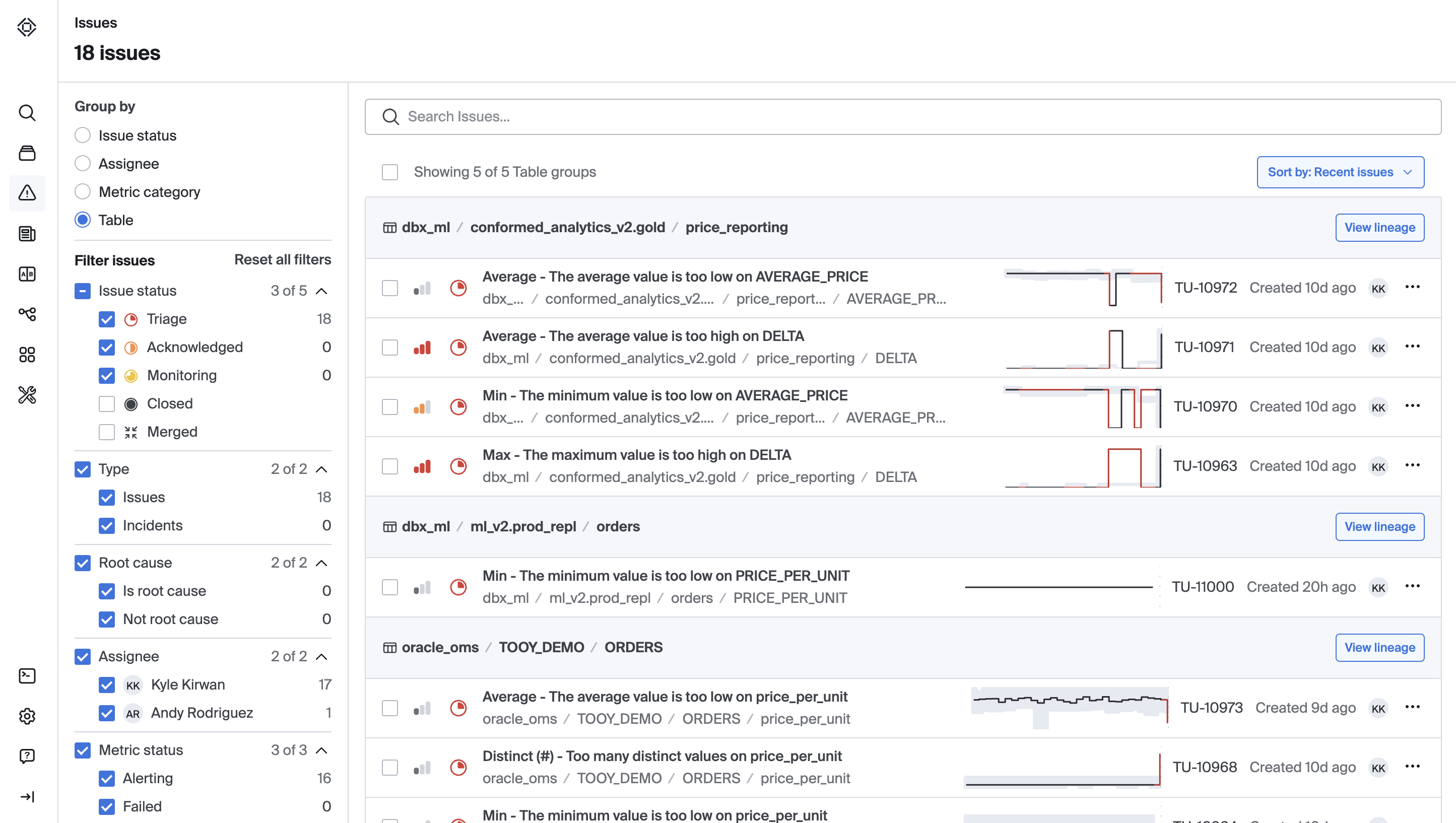 The default grouping for your workspace is by Issue status. You can also group by metric category which shows metrics grouped by metric dimension type, or by table which shows your issues grouped by each table that has an active issue.