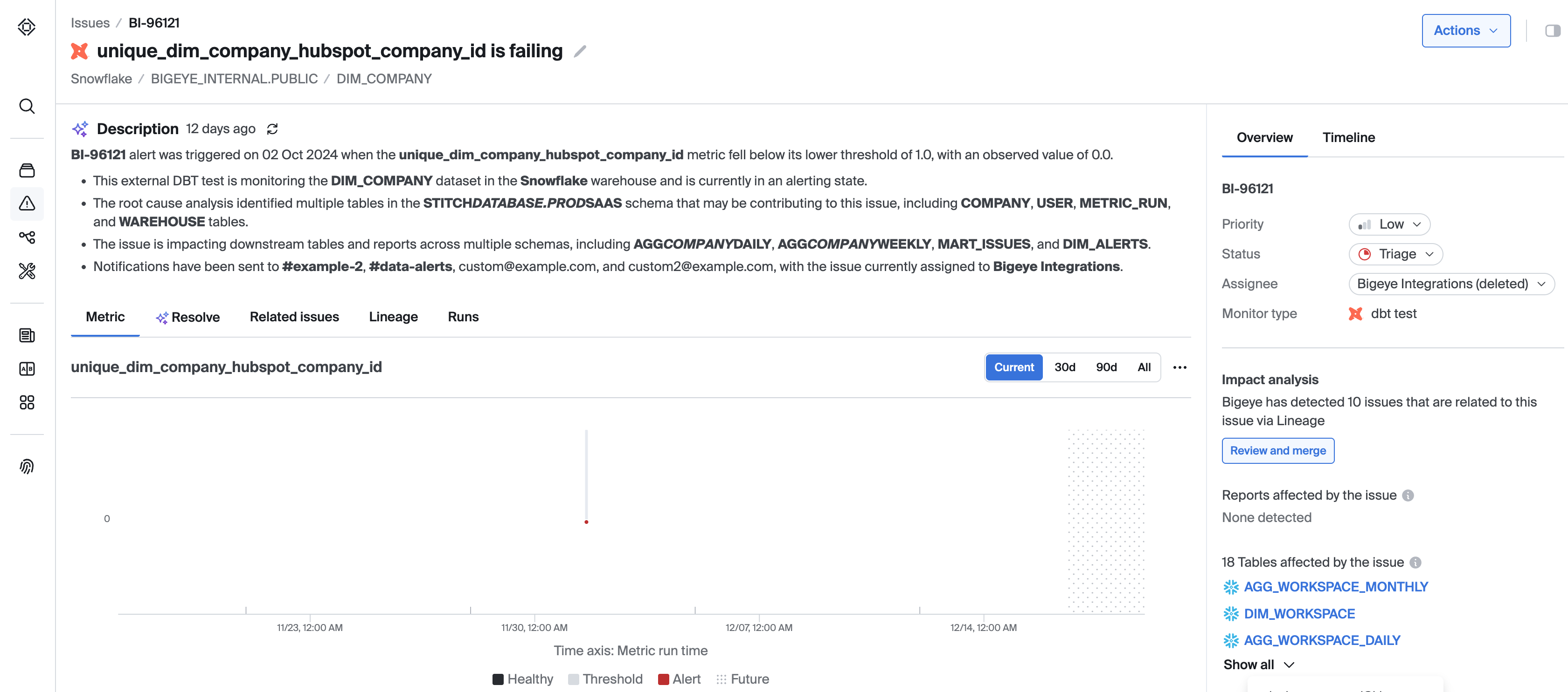 The Unified Issue Inbox capability expands Bigeye’s issue management workflow to support multiple types of monitors and issues, giving data teams a single place to observe, triage, and resolve all data-health signals—from data anomalies to dbt test failures to connection issues—Bigeye can bring your team’s concerns into a single pane of glass.
